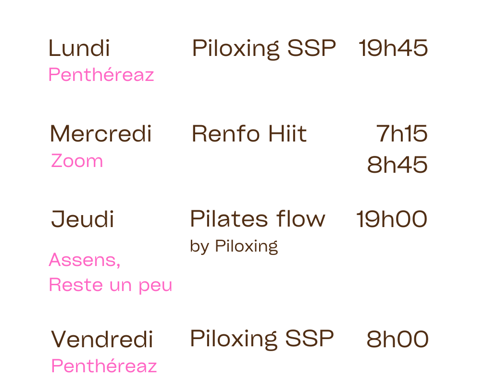 Instructrice de Piloxing certifiée depuis 2015 j’ai le plaisir de vous proposer les cours ci-dessous.
